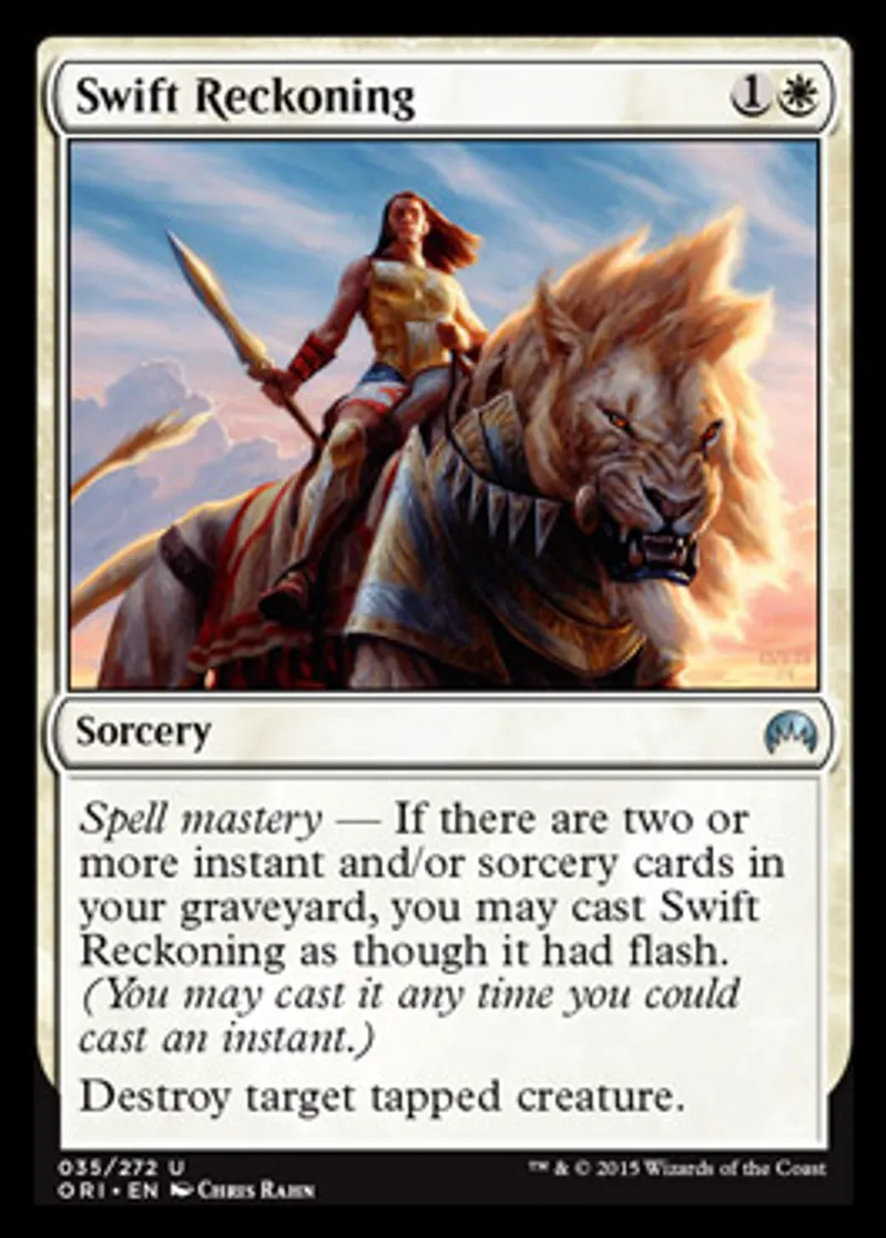 | Oracle Text | Spell mastery — If there are two or more instant and/or sorcery cards in your graveyard, you may cast Swift Reckoning as though it had flash. (You may cast it any time you could cast an instant.) Destroy target tapped creature. | ||