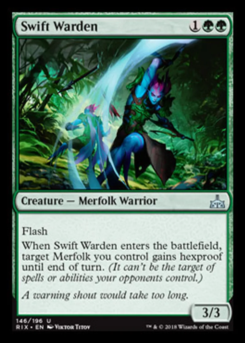 | Oracle Text | Flash When Swift Warden enters the battlefield, target Merfolk you control gains hexproof until end of turn. (It can't be the target of spells or abilities your opponents control.) | ||