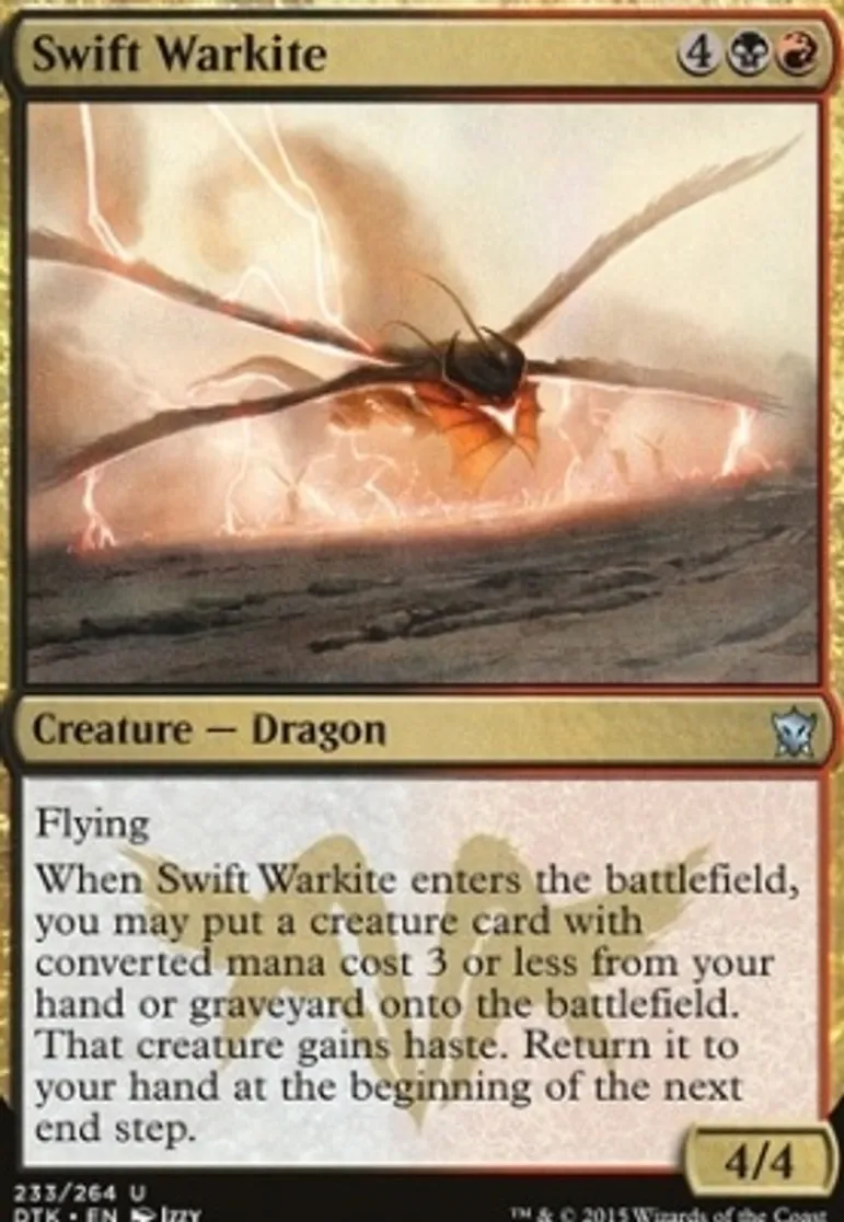 | Oracle Text | Flying When Swift Warkite enters the battlefield, you may put a creature card with converted mana cost 3 or less from your hand or graveyard onto the battlefield. That creature gains haste. Return it to your hand at the beginning of the next end step. | ||