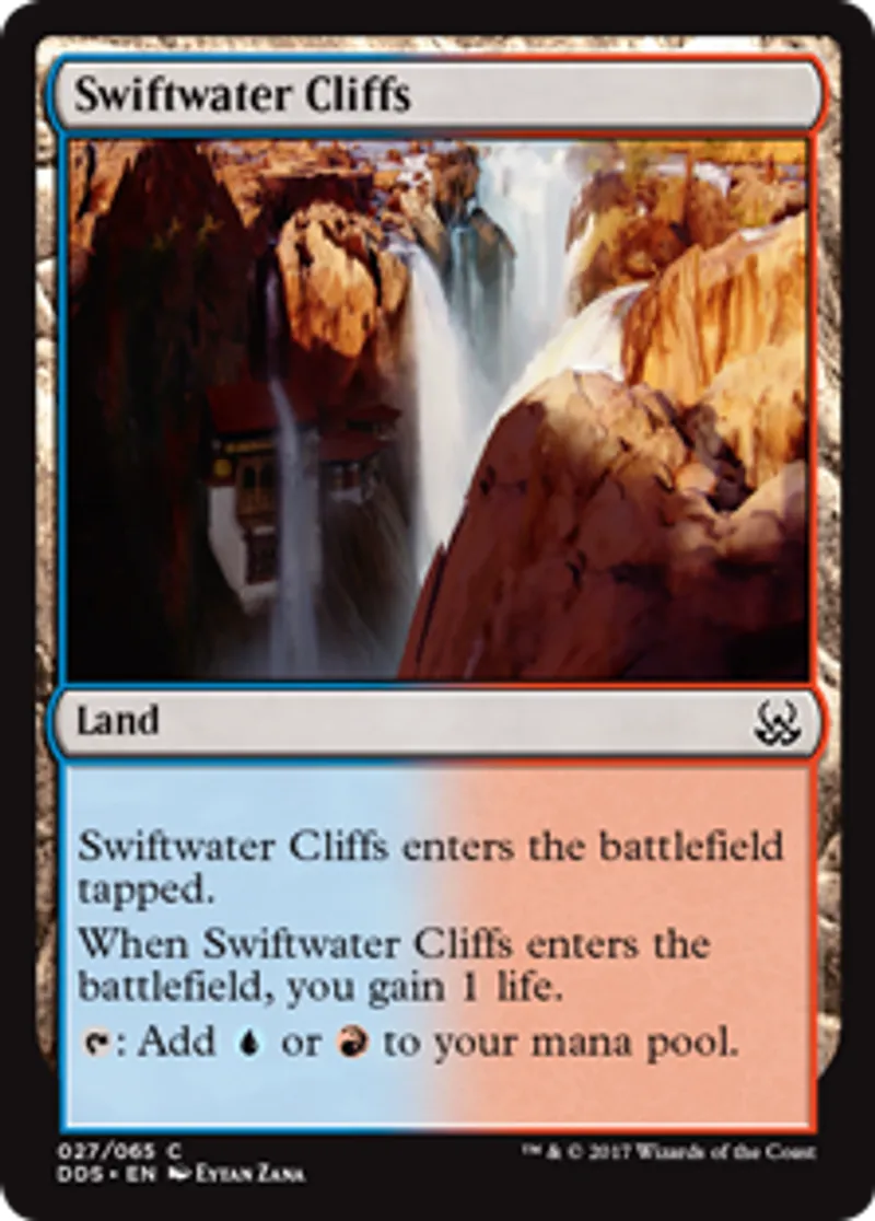 | Oracle Text | Swiftwater Cliffs enters the battlefield tapped. When Swiftwater Cliffs enters the battlefield, you gain 1 life. {{t}}: Add {{u}} or {{r}} to your mana pool. | ||