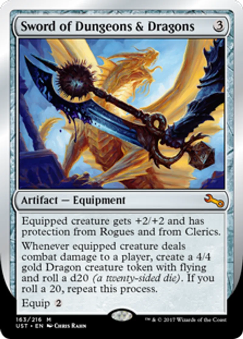 | Oracle Text | Equipped creature gets +2/+2 and has protection from Rogues and from Clerics. Whenever equipped creature deals combat damage to a player, create a 4/4 gold Dragon creature token with flying and roll a d20 (a twenty-sided die). If you roll a 20, repeat this process. Equip {{2}} | ||