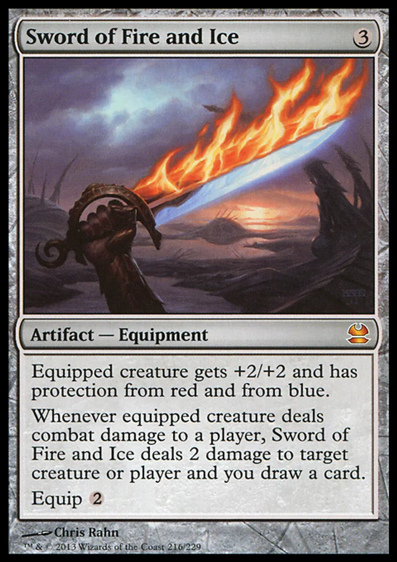 | Oracle Text | Equipped creature gets +2/+2 and has protection from red and from blue. Whenever equipped creature deals combat damage to a player, Sword of Fire and Ice deals 2 damage to target creature or player and you draw a card. Equip {{2}} | ||