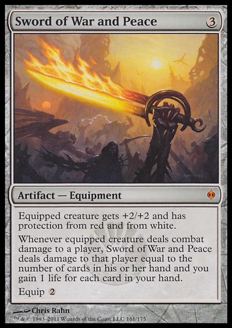 | Oracle Text | Equipped creature gets +2/+2 and has protection from red and from white. Whenever equipped creature deals combat damage to a player, Sword of War and Peace deals damage to that player equal to the number of cards in his or her hand and you gain 1 life for each card in your hand. Equip {{2}} | ||