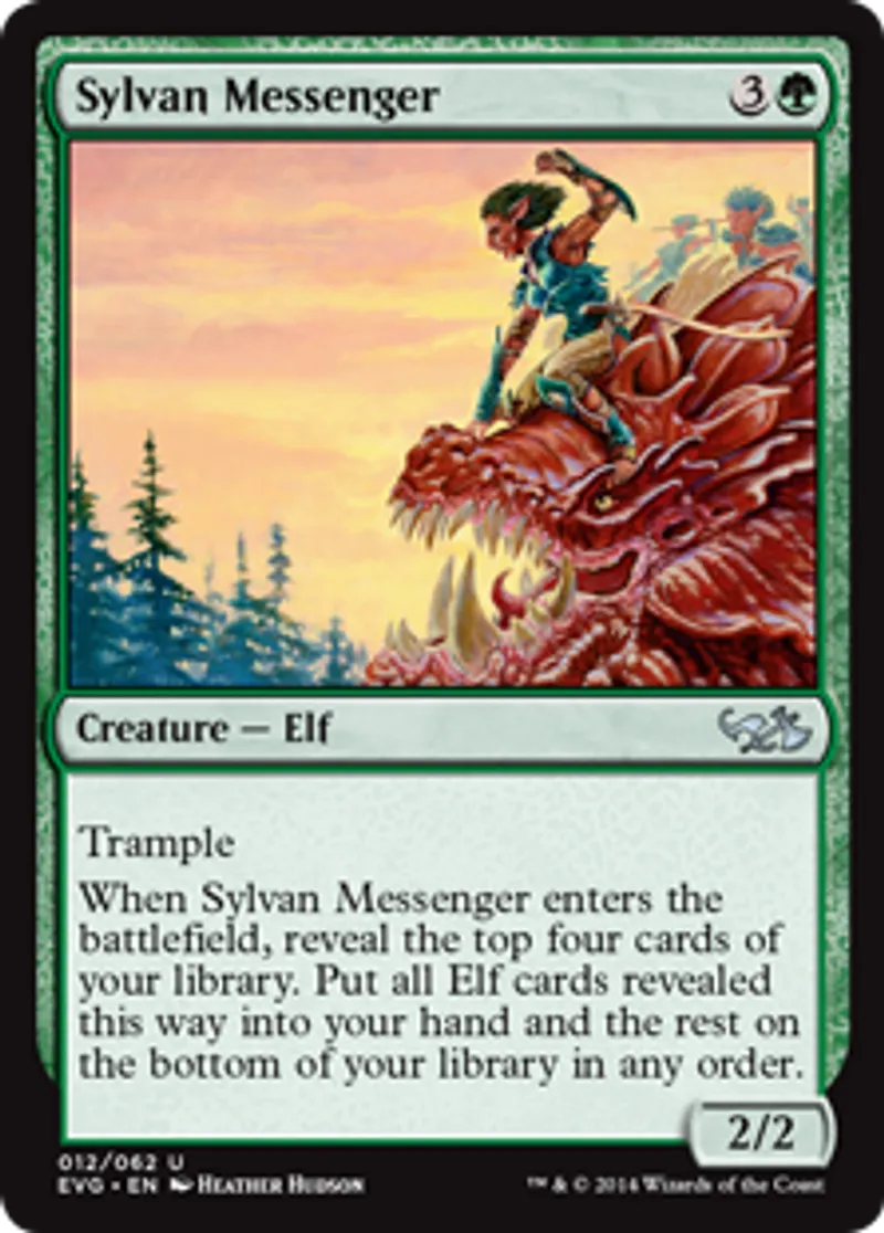 | Oracle Text | Trample (This creature can deal excess combat damage to defending player or planeswalker while attacking.) When Sylvan Messenger enters the battlefield, reveal the top four cards of your library. Put all Elf cards revealed this way into your hand and the rest on the bottom of your library in any order. | ||