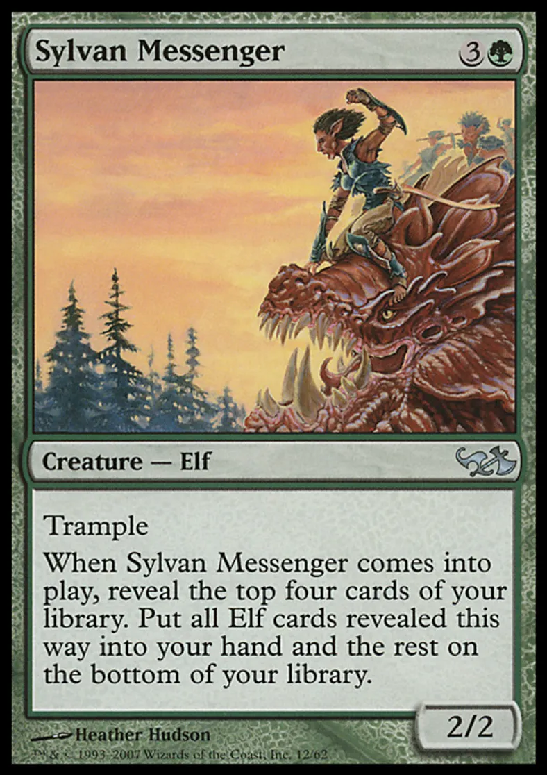 | Oracle Text | Trample When Sylvan Messenger enters the battlefield, reveal the top four cards of your library. Put all Elf cards revealed this way into your hand and the rest on the bottom of your library in any order. | ||