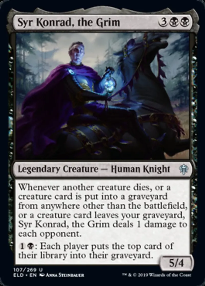 | Oracle Text | Whenever another creature dies, or a creature card is put into a graveyard from anywhere other than the battlefield, or a creature card leaves your graveyard, Syr Konrad, the Grim deals 1 damage to each opponent.