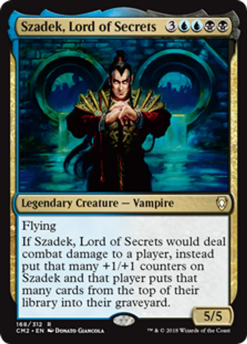 | Oracle Text | Flying If Szadek, Lord of Secrets would deal combat damage to a player, instead put that many +1/+1 counters on Szadek and that player puts that many cards from the top of their library into their graveyard. | ||