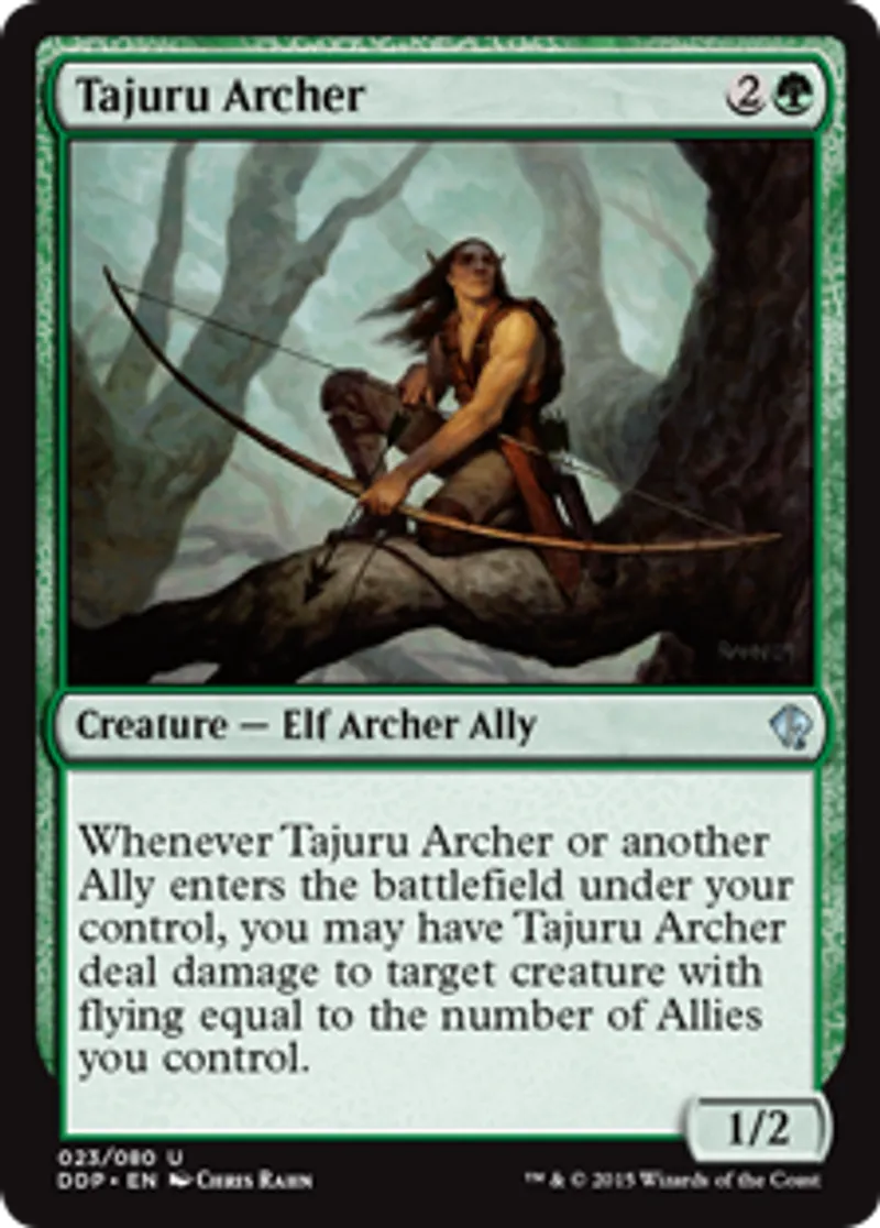 | Oracle Text | Whenever Tajuru Archer or another Ally enters the battlefield under your control, you may have Tajuru Archer deal damage to target creature with flying equal to the number of Allies you control. | ||