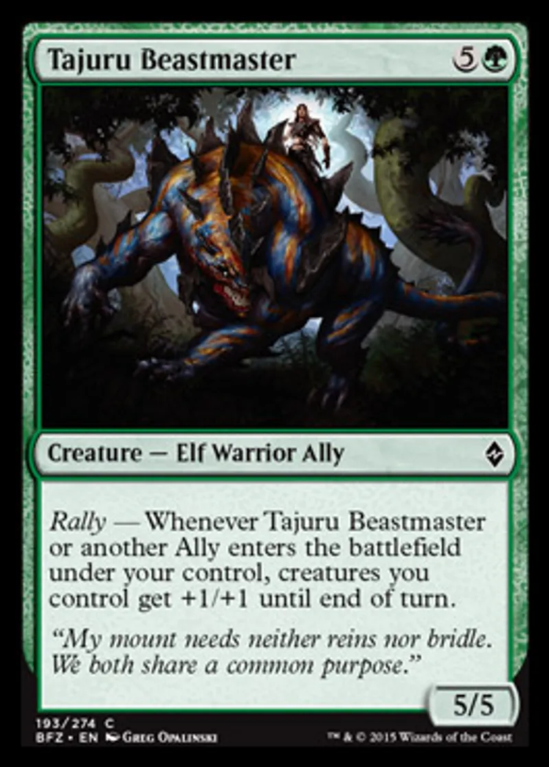 | Oracle Text | Rally — Whenever Tajuru Beastmaster or another Ally enters the battlefield under your control, creatures you control get +1/+1 until end of turn. | ||