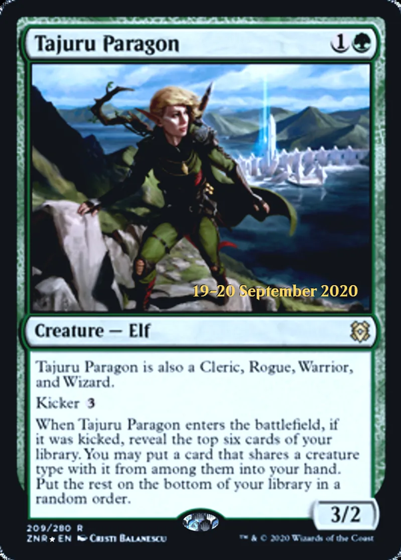 When Tajuru Paragon enters the battlefield, if it was kicked, reveal the top six cards of your library. You may put a card that shares a creature type with it from among them into your hand. Put the rest on the bottom of your library in a random order. | ||