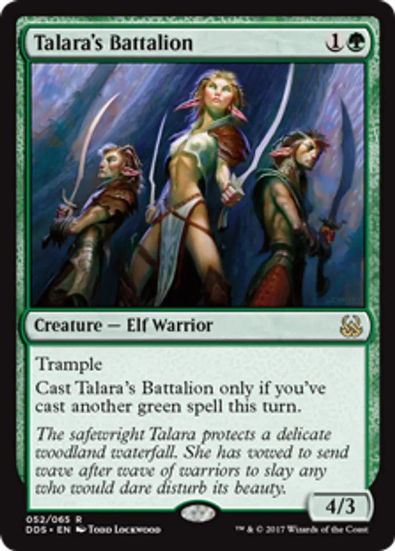 | Oracle Text | Trample Cast Talara's Battalion only if you've cast another green spell this turn. | ||