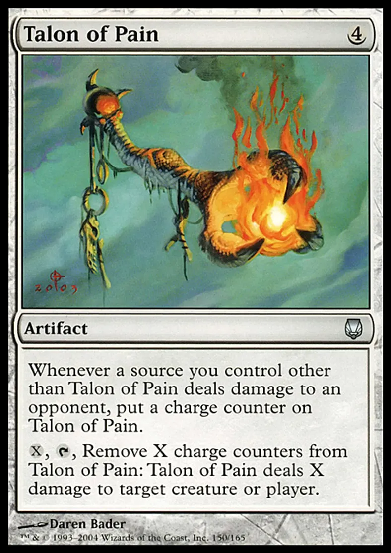 | Oracle Text | Whenever a source you control other than Talon of Pain deals damage to an opponent, put a charge counter on Talon of Pain. {{x}}, {{t}}, Remove X charge counters from Talon of Pain: Talon of Pain deals X damage to target creature or player. | ||