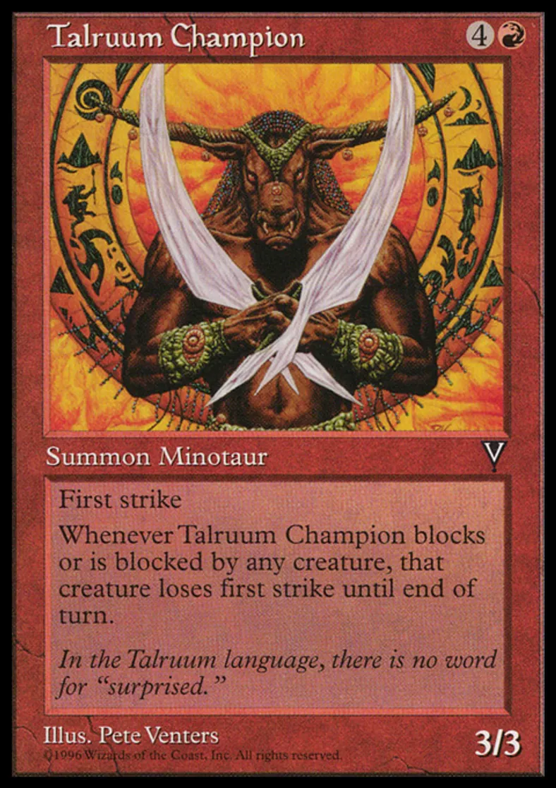 | Oracle Text | First strike Whenever Talruum Champion blocks or becomes blocked by a creature, that creature loses first strike until end of turn. | ||