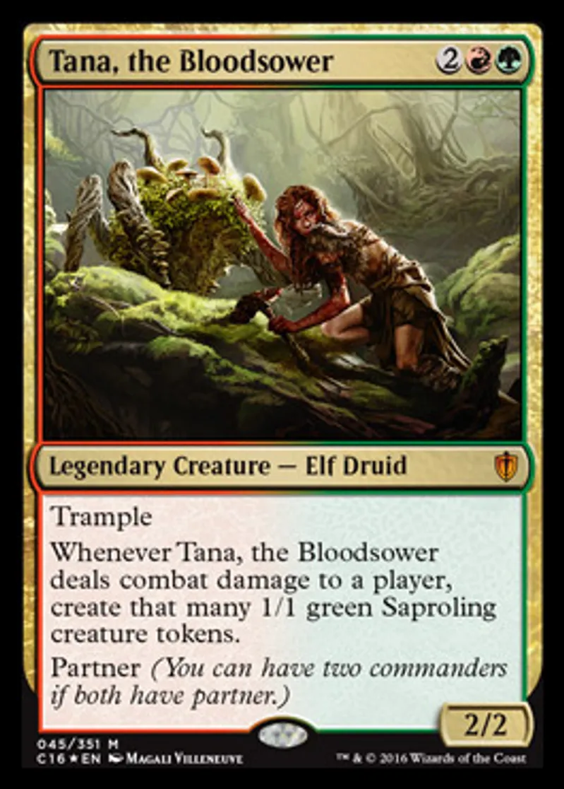 Whenever Tana, the Bloodsower deals combat damage to a player, create that many 1/1 green Saproling creature tokens.Partner (You can have two commanders if both have partner.) | ||