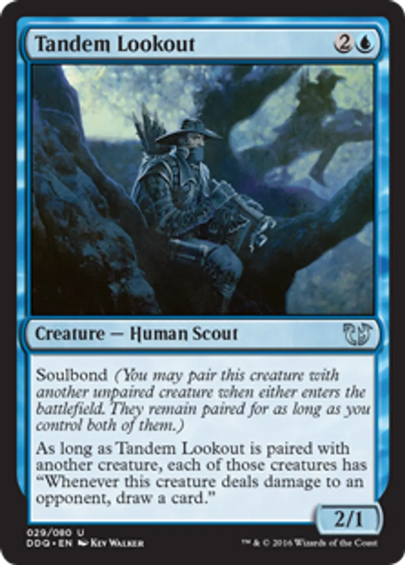 | Oracle Text | Soulbond (You may pair this creature with another unpaired creature when either enters the battlefield. They remain paired for as long as you control both of them.) As long as Tandem Lookout is paired with another creature, each of those creatures has "Whenever this creature deals damage to an opponent, draw a card." | ||