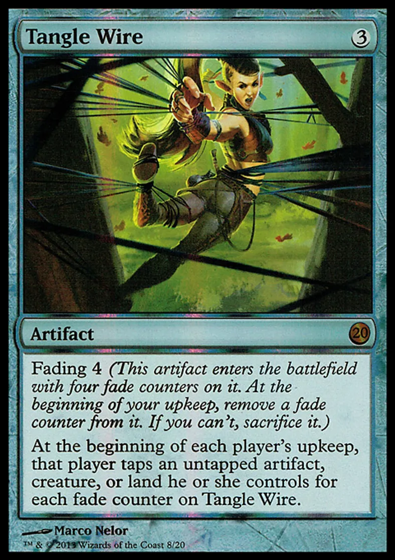 | Oracle Text | Fading 4 (This artifact enters the battlefield with four fade counters on it. At the beginning of your upkeep, remove a fade counter from it. If you can't, sacrifice it.) At the beginning of each player's upkeep, that player taps an untapped artifact, creature, or land he or she controls for each fade counter on Tangle Wire. | ||