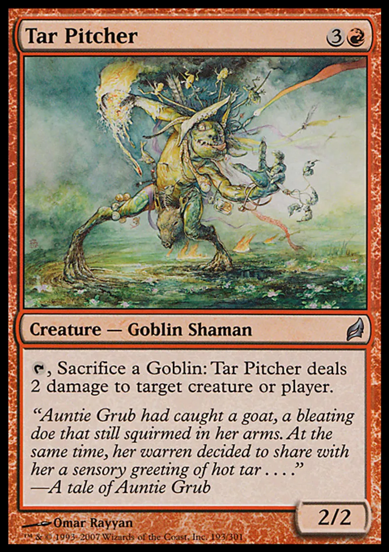 | Oracle Text | {{t}}, Sacrifice a Goblin: Tar Pitcher deals 2 damage to target creature or player. | ||