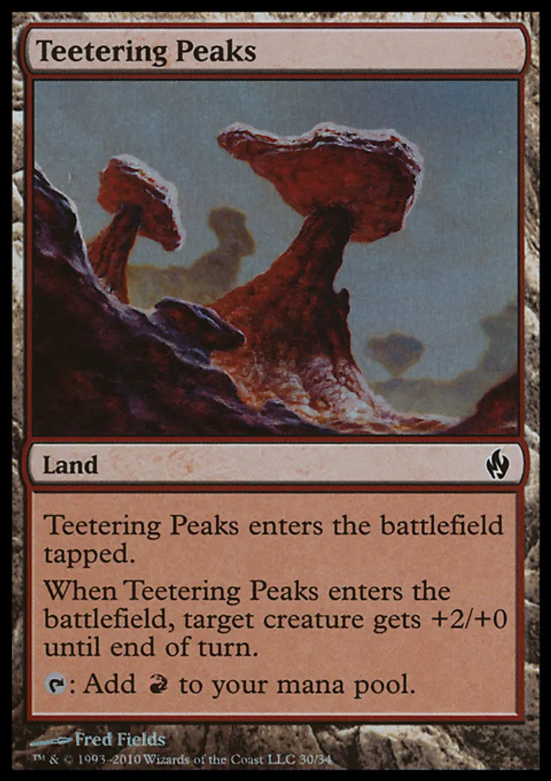 | Oracle Text | Teetering Peaks enters the battlefield tapped. When Teetering Peaks enters the battlefield, target creature gets +2/+0 until end of turn. {{t}}: Add {{r}} to your mana pool. | ||