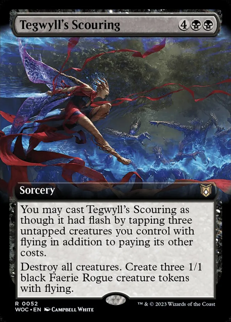 | Oracle Text | You may cast Tegwyll's Scouring as though it had flash by tapping three untapped creatures you control with flying in addition to paying its other costs.