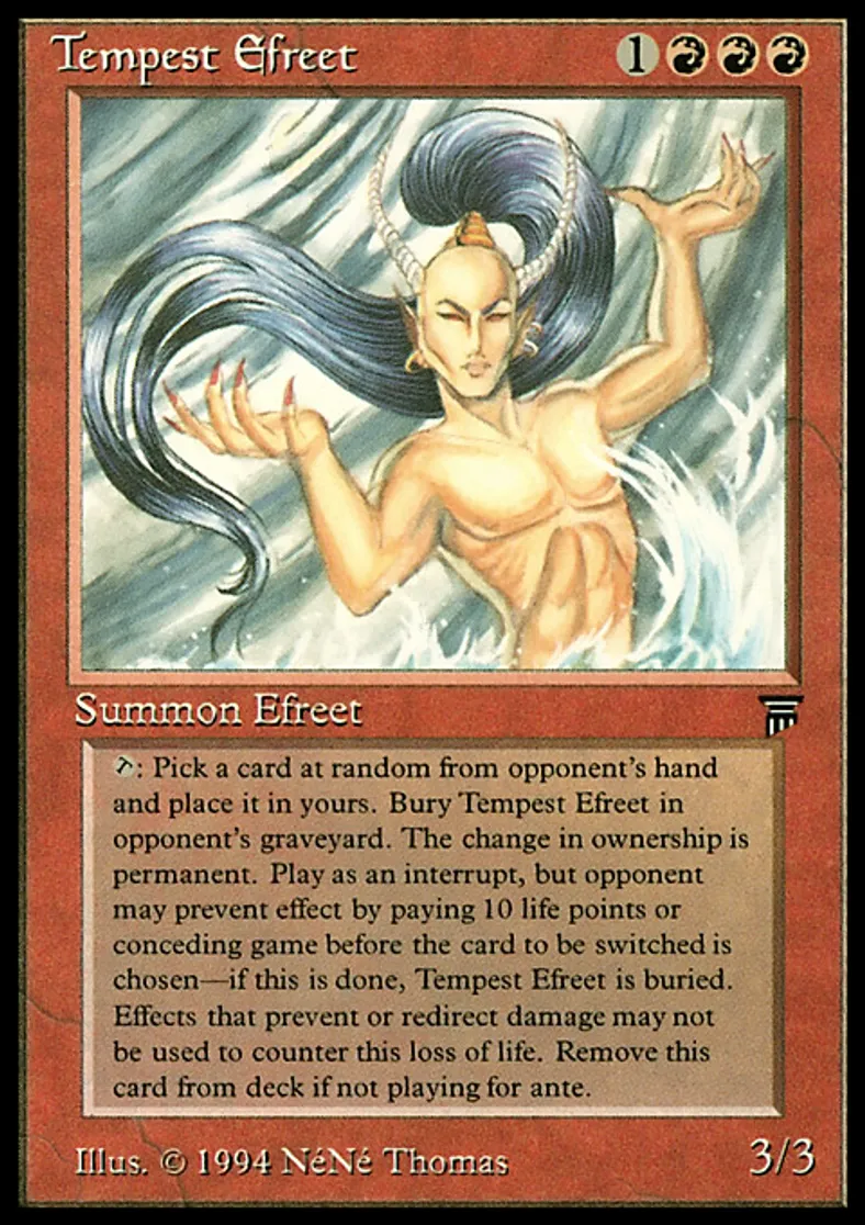| Oracle Text | Remove Tempest Efreet from your deck before playing if you're not playing for ante. {{t}}, Sacrifice Tempest Efreet: Target opponent may pay 10 life. If that player doesn't, he or she reveals a card at random from his or her hand. Exchange ownership of the revealed card and Tempest Efreet. Put the revealed card into your hand and Tempest Efreet from anywhere into that player's graveyard. | ||