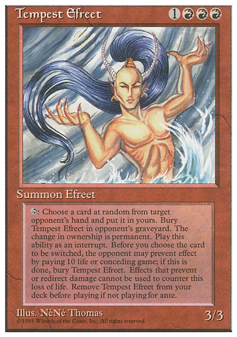 | Oracle Text | Remove Tempest Efreet from your deck before playing if you're not playing for ante. {{t}}, Sacrifice Tempest Efreet: Target opponent may pay 10 life. If that player doesn't, he or she reveals a card at random from his or her hand. Exchange ownership of the revealed card and Tempest Efreet. Put the revealed card into your hand and Tempest Efreet from anywhere into that player's graveyard. | ||
