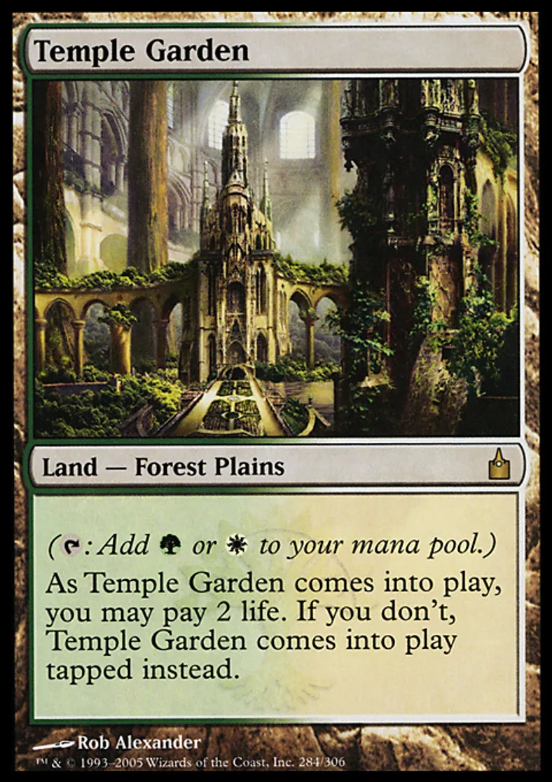 | Oracle Text | ({{t}}: Add {{g}} or {{w}} to your mana pool.) As Temple Garden enters the battlefield, you may pay 2 life. If you don't, Temple Garden enters the battlefield tapped. | ||