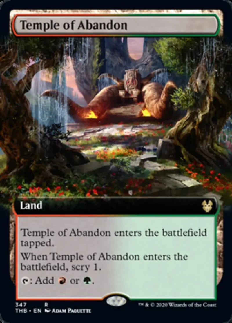 | Oracle Text | Temple of Abandon enters the battlefield tapped.\r\n\r\nWhen Temple of Abandon enters the battlefield, scry 1. (Look at the top card of your library. You may put that card on the bottom of your library.)\r\n\r\n{{t}}: Add {{r}} or {{g}}. | ||