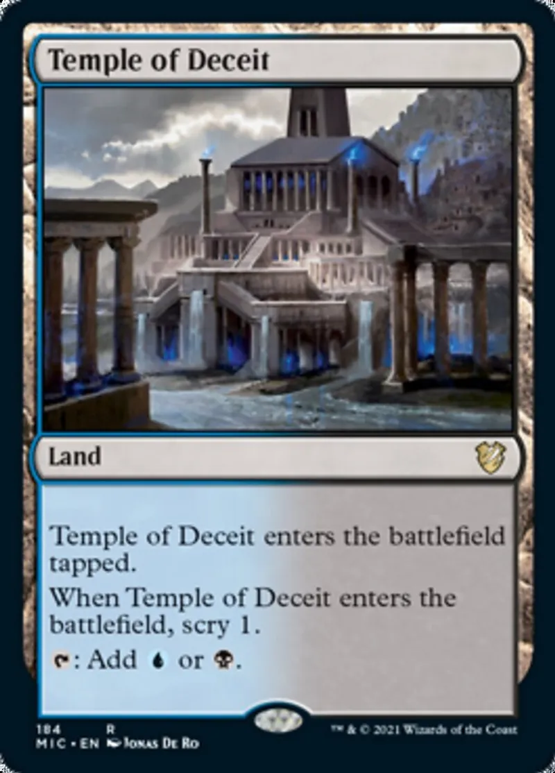 When Temple of Deceit enters the battlefield, scry 1. (Look at the top card of your library. You may put that card on the bottom of your library.)