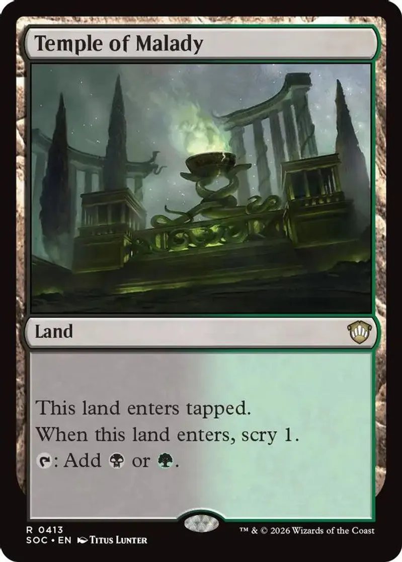 Magic: the Gathering (mtg) Rare land Temple of Malady from Commander: Secrets of Strixhaven (SOC) last updated 2026-04-17 00:26:10