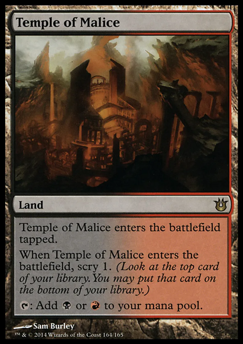 | Oracle Text | Temple of Malice enters the battlefield tapped. When Temple of Malice enters the battlefield, scry 1. (Look at the top card of your library. You may put that card on the bottom of your library.) {{t}}: Add {{b}} or {{r}} to your mana pool. | ||