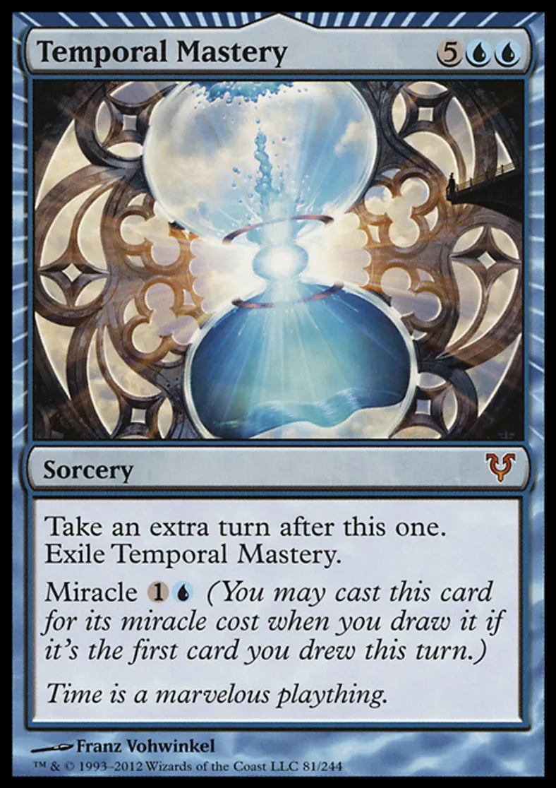 | Oracle Text | Take an extra turn after this one. Exile Temporal Mastery. Miracle {{1}}{{u}} (You may cast this card for its miracle cost when you draw it if it's the first card you drew this turn.) | ||