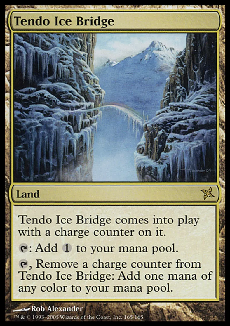 | Oracle Text | Tendo Ice Bridge enters the battlefield with a charge counter on it. {{t}}: Add {{1}} to your mana pool. {{t}}, Remove a charge counter from Tendo Ice Bridge: Add one mana of any color to your mana pool. | ||