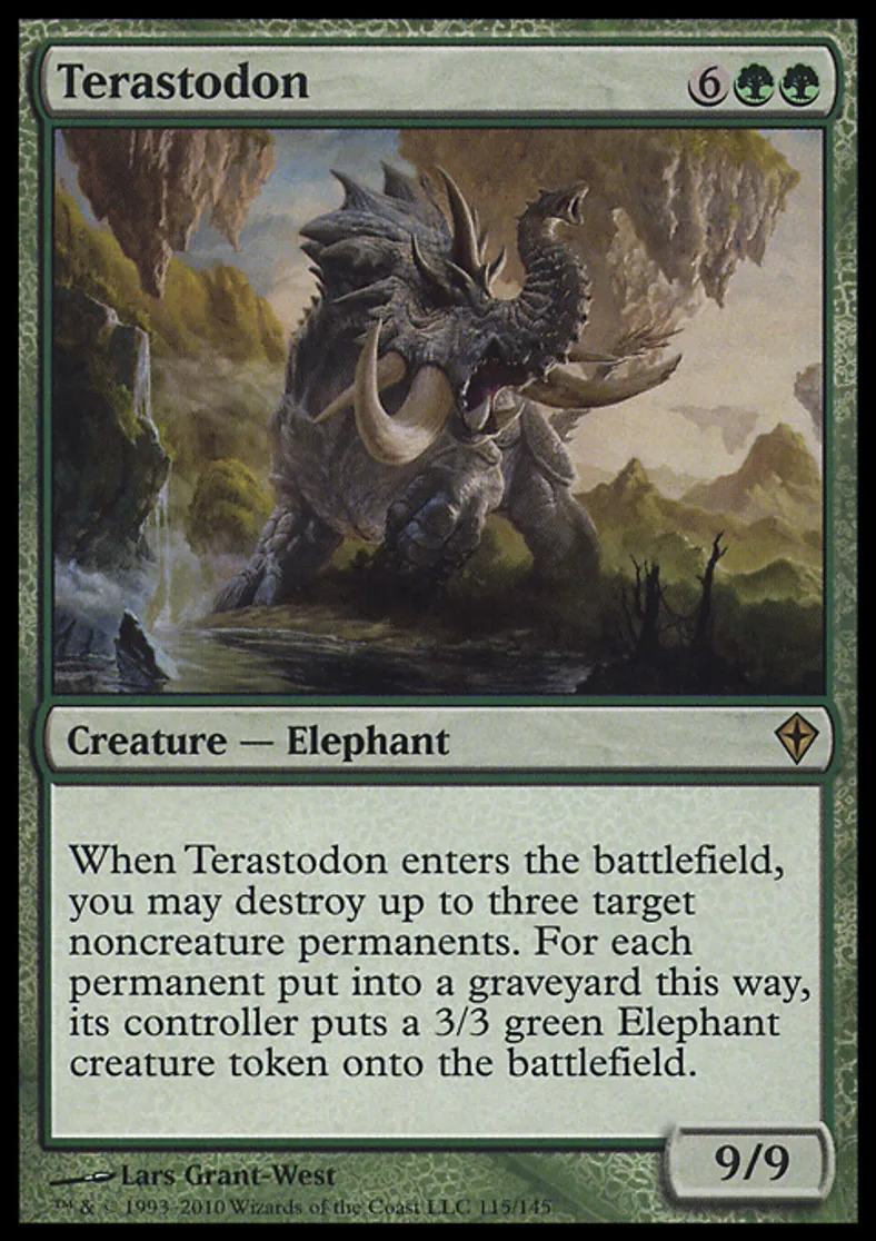 | Oracle Text | When Terastodon enters the battlefield, you may destroy up to three target noncreature permanents. For each permanent put into a graveyard this way, its controller puts a 3/3 green Elephant creature token onto the battlefield. | ||