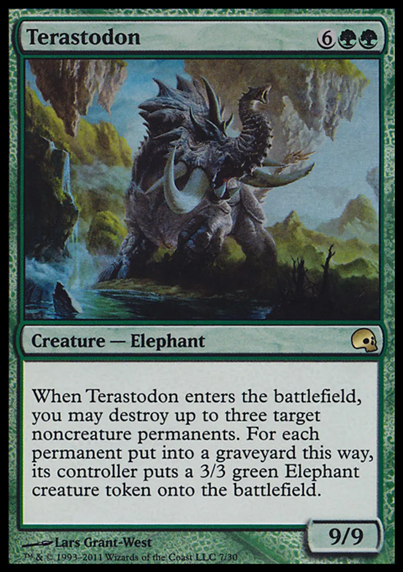 | Oracle Text | When Terastodon enters the battlefield, you may destroy up to three target noncreature permanents. For each permanent put into a graveyard this way, its controller puts a 3/3 green Elephant creature token onto the battlefield. | ||