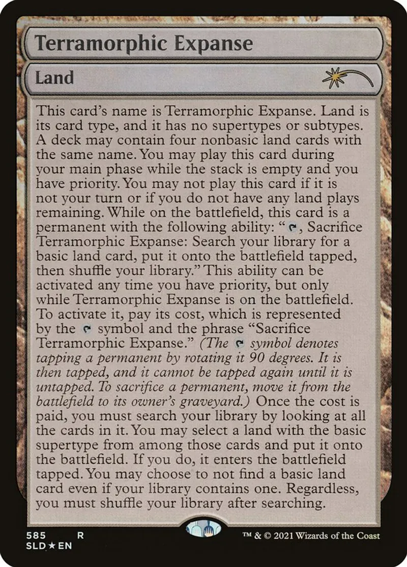 | Oracle Text | {{t}}, Sacrifice Terramorphic Expanse: Search your library for a basic land card, put it onto the battlefield tapped, then shuffle. | ||