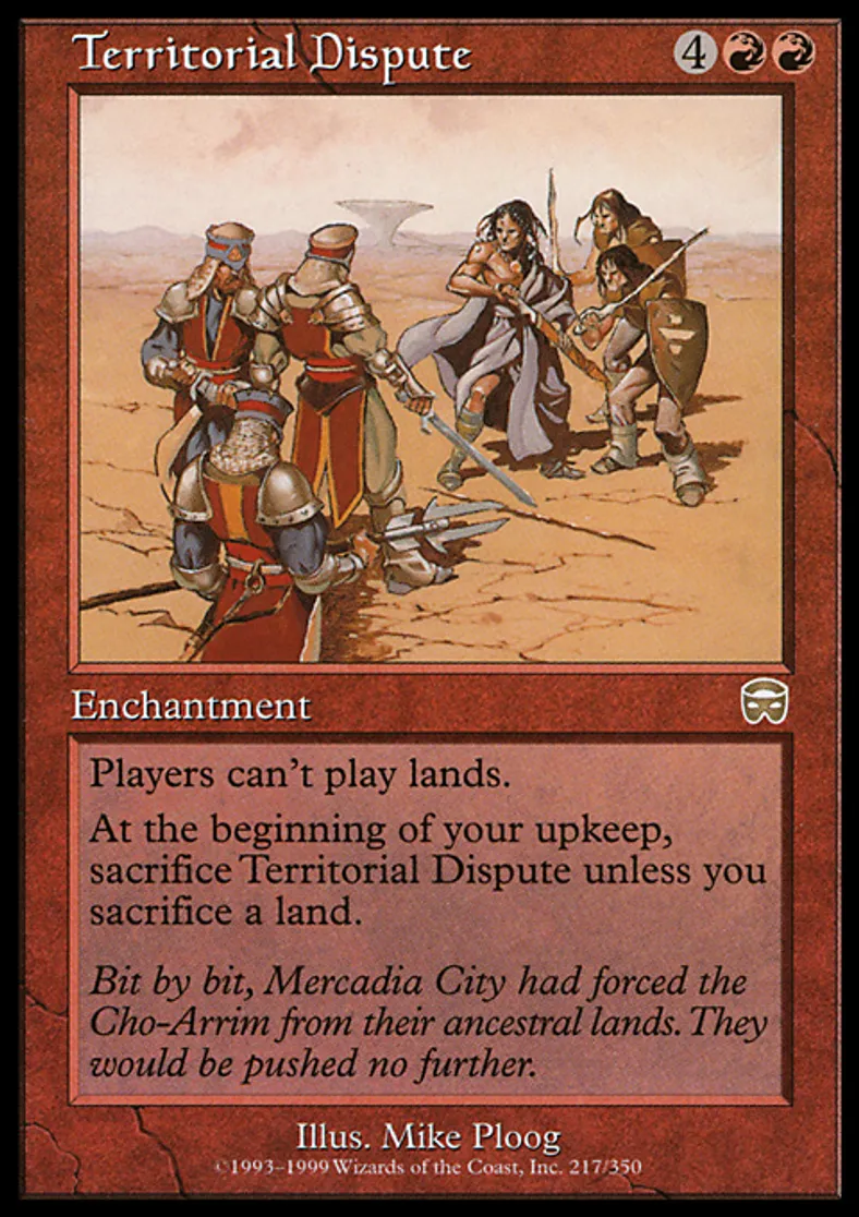 | Oracle Text | At the beginning of your upkeep, sacrifice Territorial Dispute unless you sacrifice a land. Players can't play lands. | ||