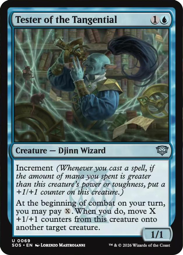 Magic: the Gathering (mtg) Uncommon creature — djinn wizard Tester of the Tangential from Secrets of Strixhaven (SOS) last updated 2026-04-16 23:13:39