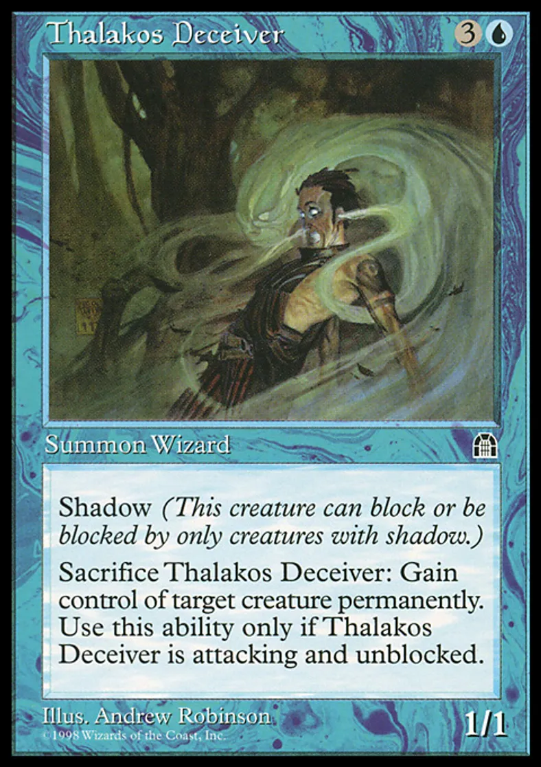 | Oracle Text | Shadow (This creature can block or be blocked by only creatures with shadow.) Whenever Thalakos Deceiver attacks and isn't blocked, you may sacrifice it. If you do, gain control of target creature. (This effect lasts indefinitely.) | ||