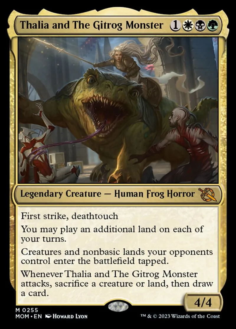 Thalia and The Gitrog Monster is a mythic in the set March of the Machine.