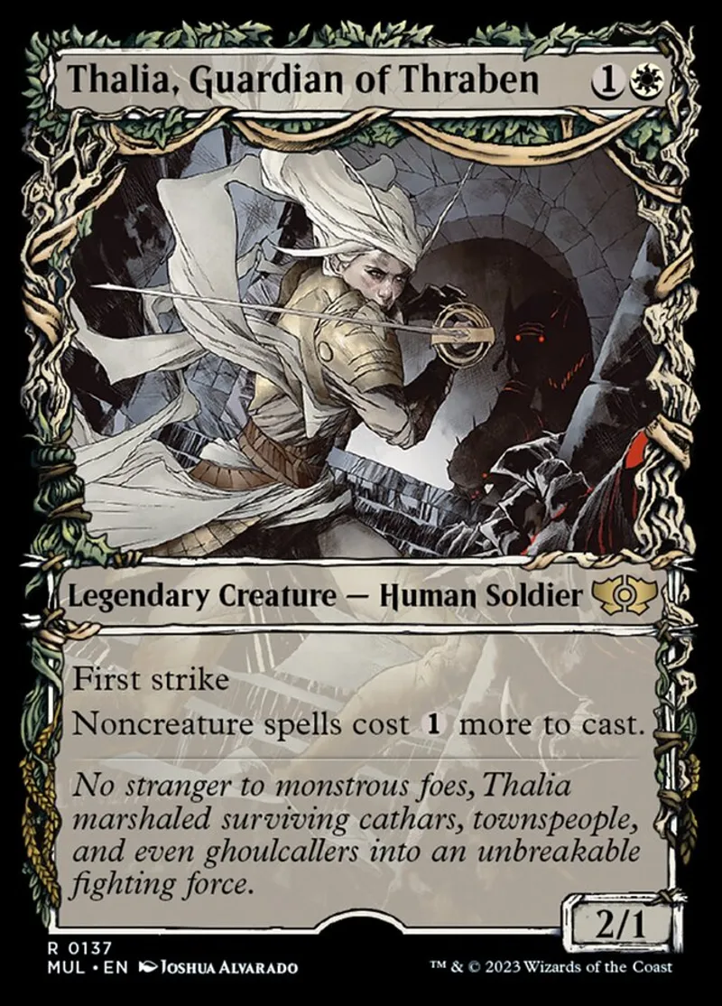 | Flavor Text | No stranger to monstrous foes, Thalia marshaled surviving cathars, townspeople, and even ghoulcallers into an unbreakable fighting force. | ||