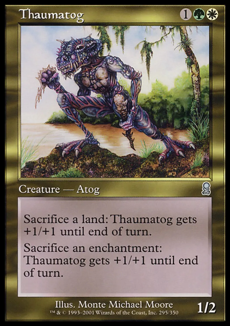 | Oracle Text | Sacrifice a land: Thaumatog gets +1/+1 until end of turn. Sacrifice an enchantment: Thaumatog gets +1/+1 until end of turn. | ||