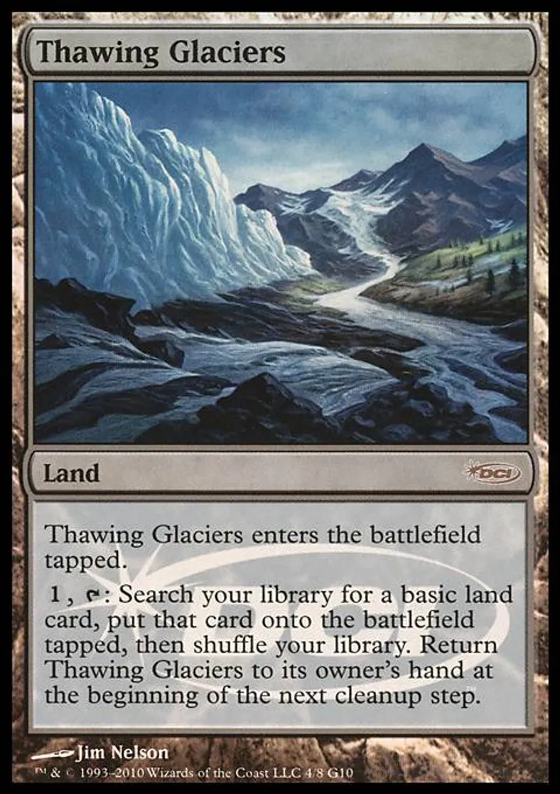 {1}, {T}: Search your library for a basic land card, put that card onto the battlefield tapped, then shuffle your library. Return Thawing Glaciers to its owner's hand at the beginning of the next cleanup step. | ||