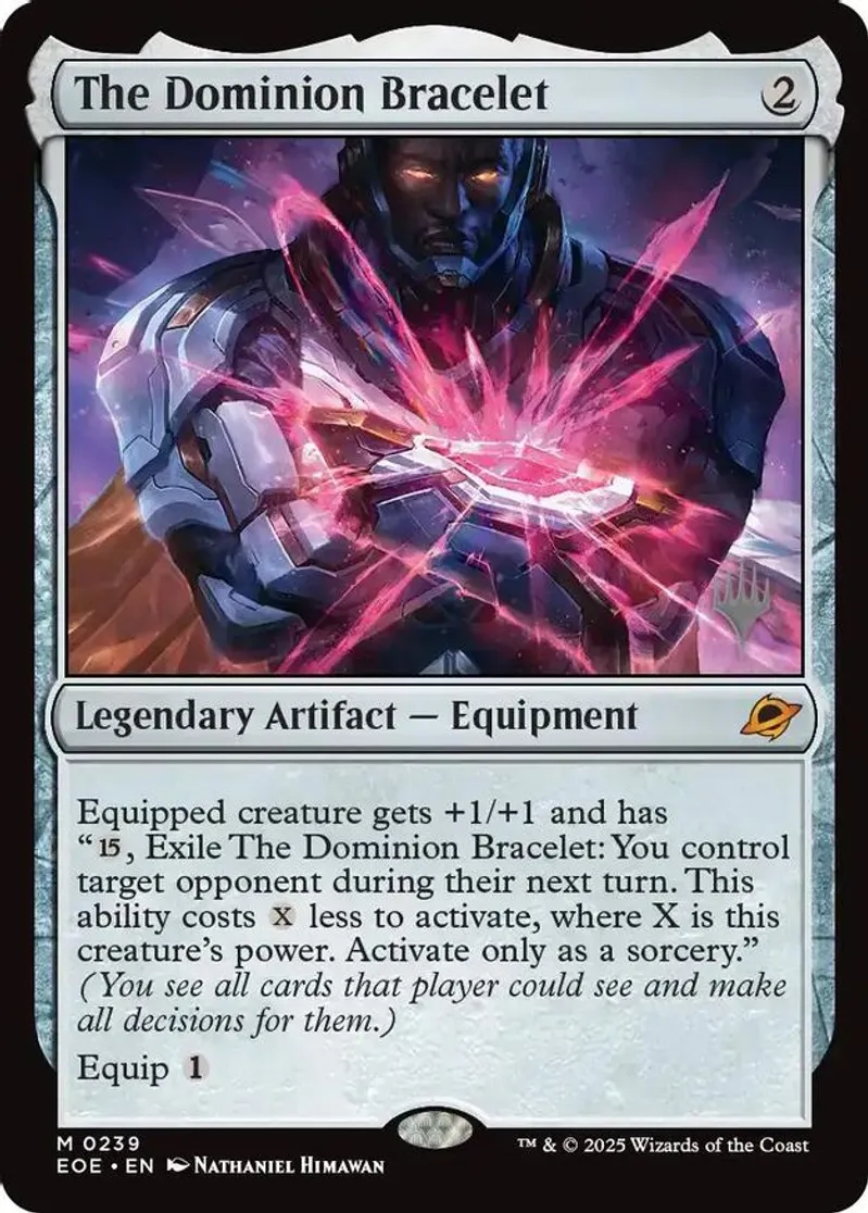 Magic: the Gathering (mtg) Mythic Rare legendary artifact — equipment The Dominion Bracelet from Promo Pack: Edge of Eternities (PPEOE) last updated 2026-03-04 16:09:02
