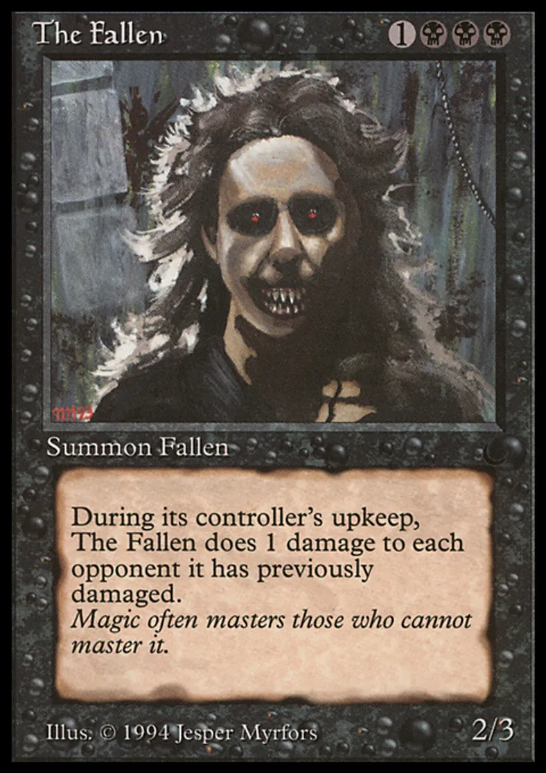 | Oracle Text | At the beginning of your upkeep, The Fallen deals 1 damage to each opponent it has dealt damage to this game. | ||