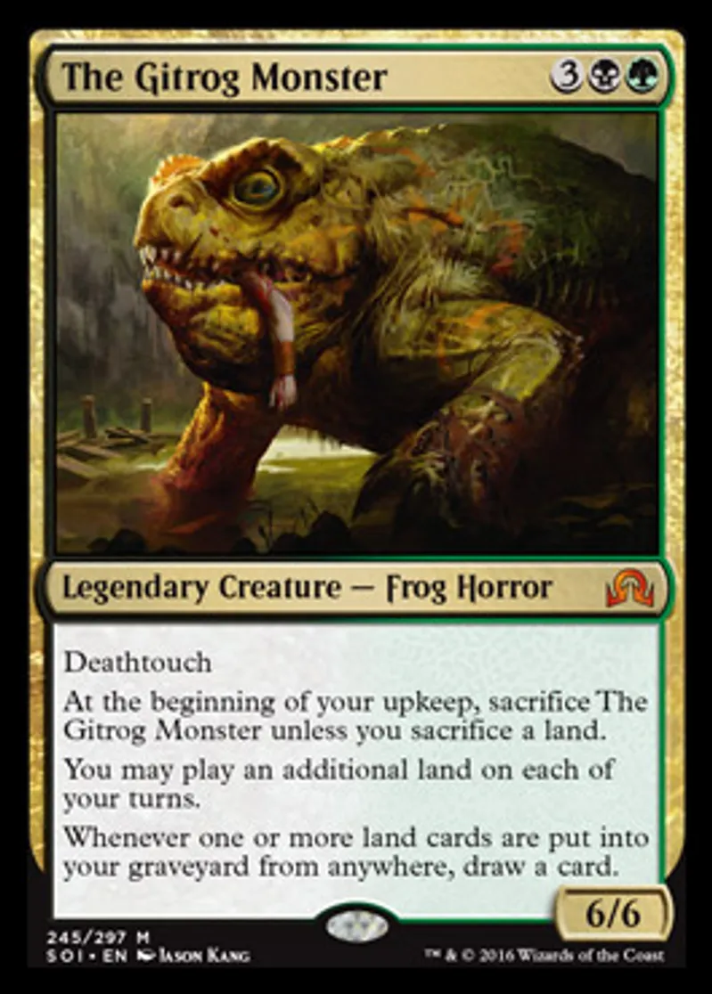 | Oracle Text | Deathtouch At the beginning of your upkeep, sacrifice The Gitrog Monster unless you sacrifice a land. You may play an additional land on each of your turns. Whenever one or more land cards are put into your graveyard from anywhere, draw a card. | ||