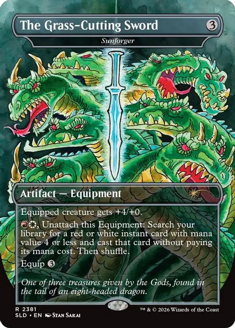 Magic: the Gathering (mtg) Rare artifact — equipment The Grass-Cutting Sword - Sunforger from Secret Lair Drop Series (SLD) last updated 2026-03-03 02:57:01