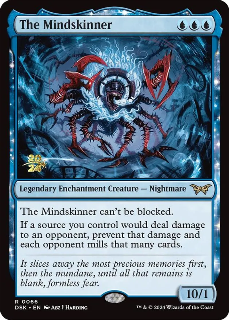 | Oracle Text | the mindskinner can't be blocked. if a source you control would deal damage to an opponent, prevent that damage and each opponent mills that many cards. | ||