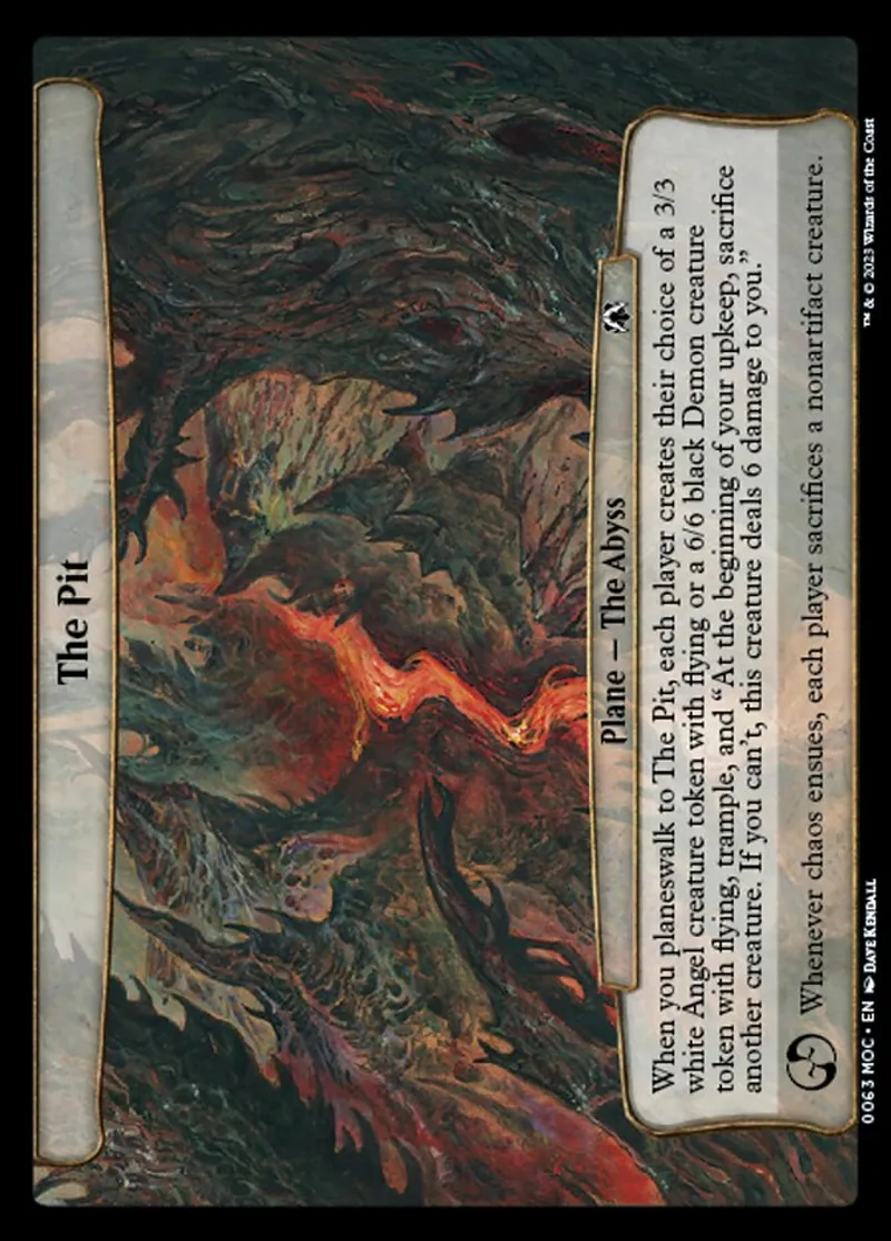 | Oracle Text | When you planeswalk to The Pit, each player creates their choice of a 3/3 white Angel creature token with flying or a 6/6 black Demon creature token with flying, trample, and "At the beginning of your upkeep, sacrifice another creature. If you can't, this creature deals 6 damage to you."