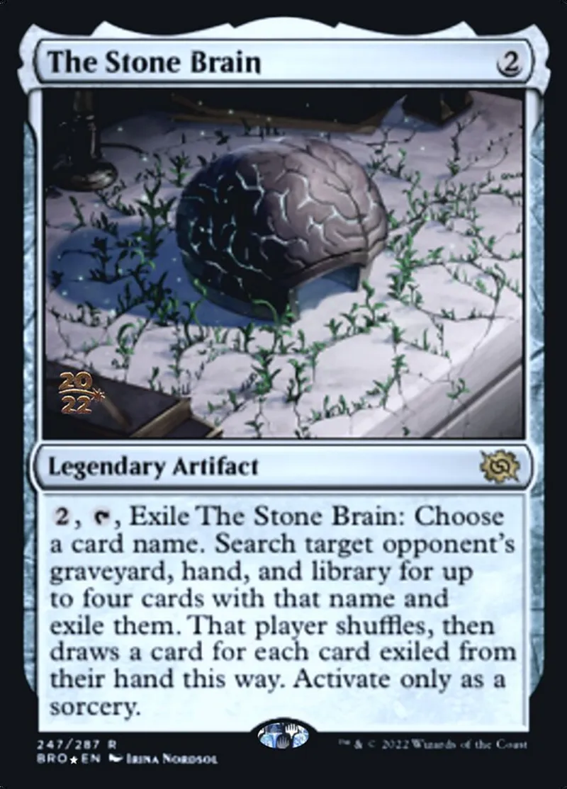 | Oracle Text | {{2}}, {{t}}, Exile The Stone Brain: Choose a card name. Search target opponent’s graveyard, hand, and library for up to four cards with that name and exile them. That player shuffles, then draws a card for each card exiled from their hand this way. Activate only as a sorcery. | ||