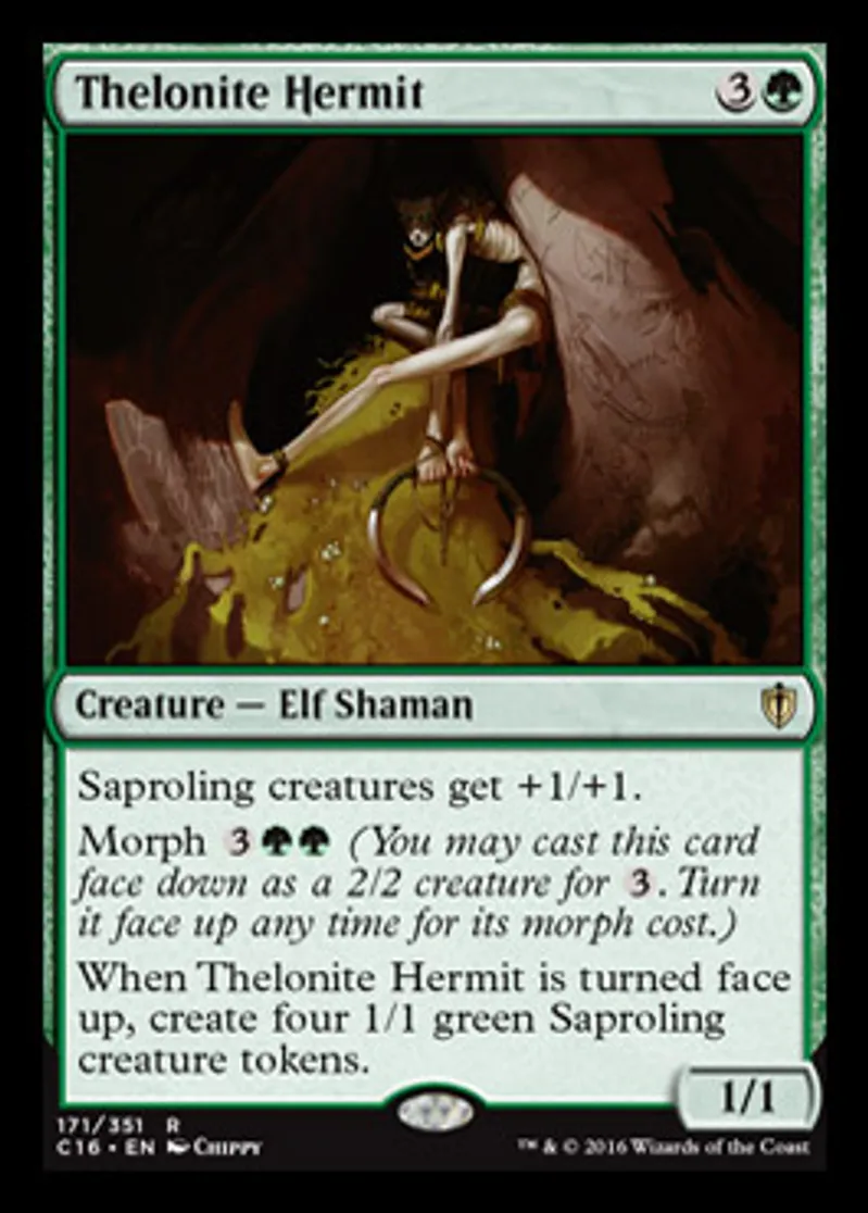 | Oracle Text | Saproling creatures get +1/+1. Morph {{3}}{{g}}{{g}} (You may cast this card face down as a 2/2 creature for {{3}}. Turn it face up any time for its morph cost.) When Thelonite Hermit is turned face up, create four 1/1 green Saproling creature tokens. | ||